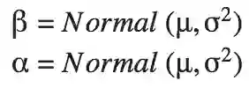 其中 β 确定概率函数的形状,α 是偏移项,控制函数从左向右移动。由于这两个参数都既可以是正的或负的,也没有特定的边界或大小的偏差,我们可以将它们建模为高斯分布随机变量: