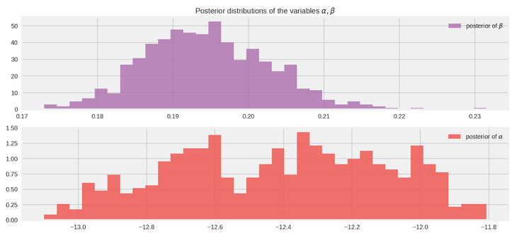注意 15-18 行怎样简单地对生成模型、每行的随机变量进行编码。同时也要注意 rv_alpha 和 rv_beta 表示此前对 𝛼 和 β 分布的随机变量。相比之下,rv_observed 表示给定一个参数为 𝛼 和 β 的概率分布情况下,温度和 O 形圈输出的观察可能性的条件分布。