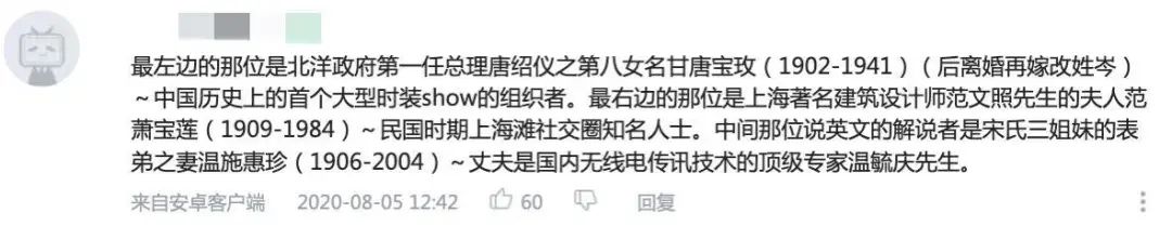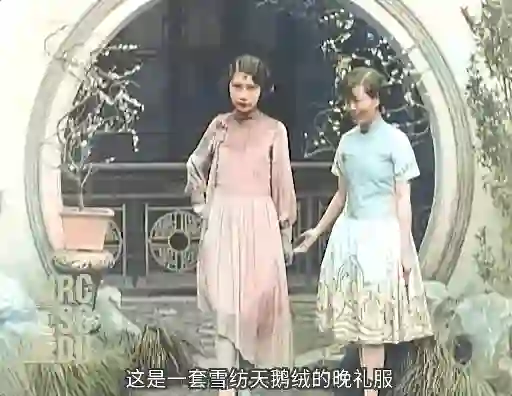 最左边的那位是北洋政府第一任总理唐绍仪之第八女名甘唐宝玫(1902-1941)(后离婚再嫁改姓岑)~中国历史上的首个大型时装show的组织者。最右边的那位是上海著名建筑设计师范文照先生的夫人范萧宝莲(1909-1984)~民国时期上海滩社交圈知名人士。中间那位说英文的解说者是宋氏三姐妹的表弟之妻温施惠珍(1906-2004)~丈夫是国内无线电传讯技术的顶级专家温毓庆先生。