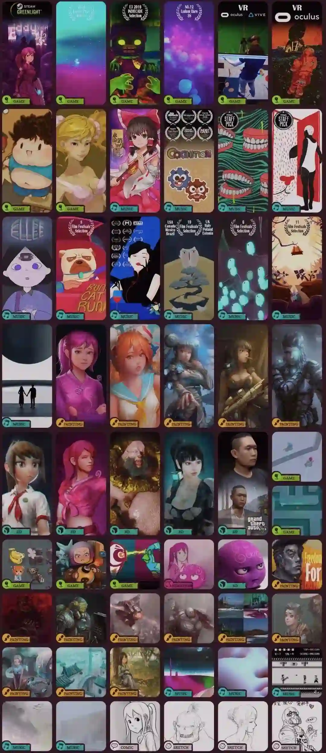 来感受一下他的作品,包括Steam游戏、原创游戏音乐、sketch手绘、动漫等等各种位面。