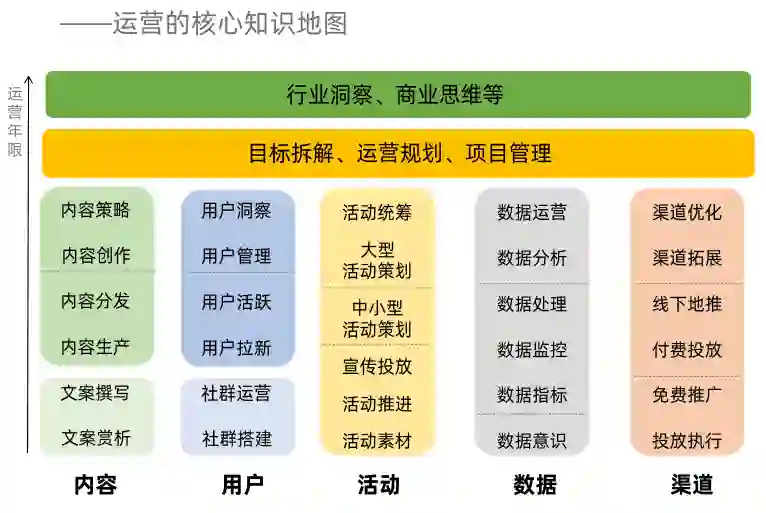 我们先来看看运营的核心知识地图,在一个完整的项目中,我们要有内容、用户、活动、数据、渠道方面的运营能力,其中又包含了能力的多方体现;再进阶一步运营也需要进行规划和管理,以及行业洞察等等。