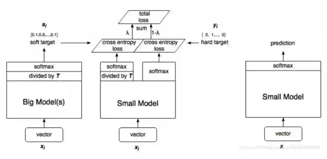 第二种是在计算损失函数的时候,使用温度参数T,温度参数越高,得到的概率值越平缓。通过升高温度T,我们获取“软目标”,进而训练小模型