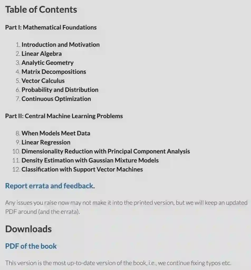 资料获取方式:该书官网或者关注下方公众号,回复 MML 即可获取该书最新版PDF百度网盘地址: