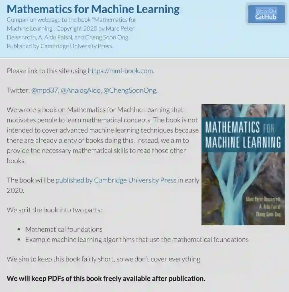 《面向机器学习的数学(Mathematics for Machine Learning)》是一本新书,由伦敦帝国理工学院的几位教授出版,于2020年出版,该书pdf电子版是完全公开的,在该书主页可以直接下载:https://mml-book.github.io/