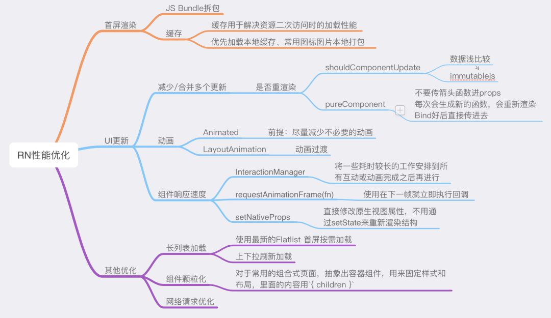 作者总结了 RN 性能核心优化点主要体现在首屏渲染优化、UI 更新优化和其他方面(代码层面),具体看下图: