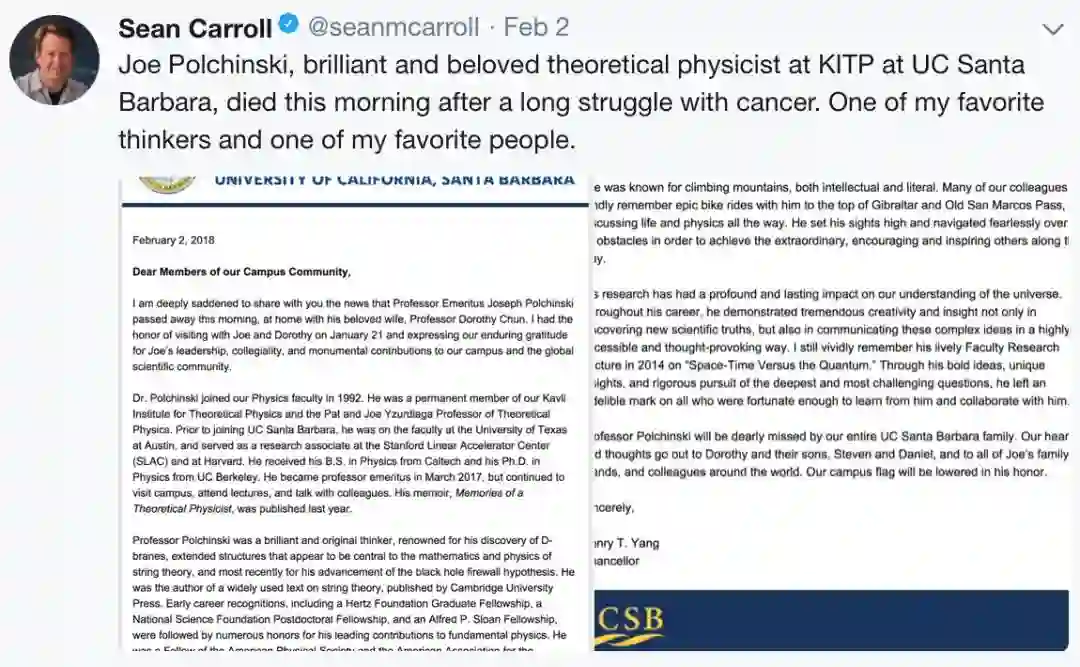 ○ 2018年2月2日,著名的物理学家Sean Carroll在twitter上发布了Polchinski教授去世的信息。