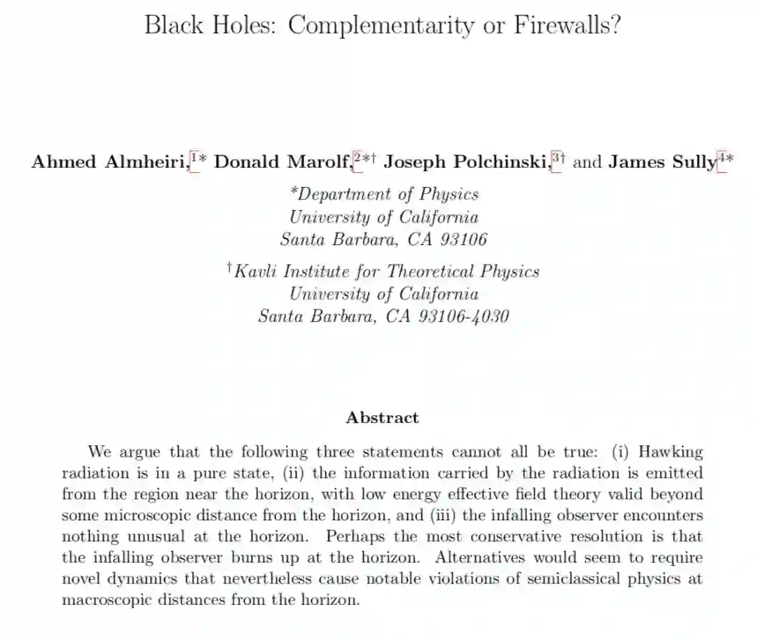 ○ 2012年,Polchinski与其它三位合作者提出了火墙悖论,使黑洞信息悖论变得更加扑朔迷离。| 图片来源:arXiv:1207.3123v4