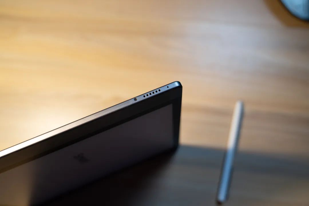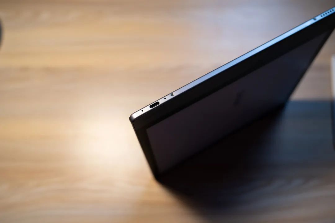 太空灰的配色低调沉稳。后盖和边框是一体成型的金属,一体感很强。类肤质的手感,触感很舒服。独特的商务感和科技感!左侧有Type-c接口,好评!还有麦克风和扬声器,对,他是可以录音和播放的。这个我们一会再讲。