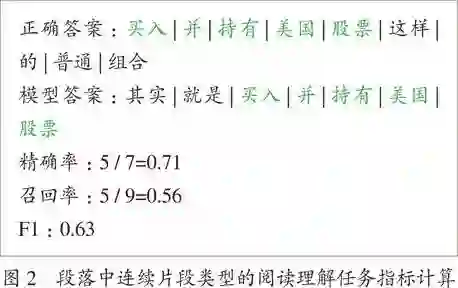 根据答案的形式,机器阅读理解任务可分为段落中连续片段和多项选择两种。对于段落中连续片段任务,答案一定是段落中一段连续的文本,即模型只需要给出答案在给定段落中的起止位置,如图1。代表数据集有SQuAD[2]、CoQA[3]。对于此类阅读理解任务,评判的标准一般为正确答案与模型给出答案之间分词后的精确率、召回率和F1分数(如图2)。多项选择任务即给定若干备选项,算法需要选出一个或多个正确选项。代表数据集有McTest[1]、ARC[6]等。