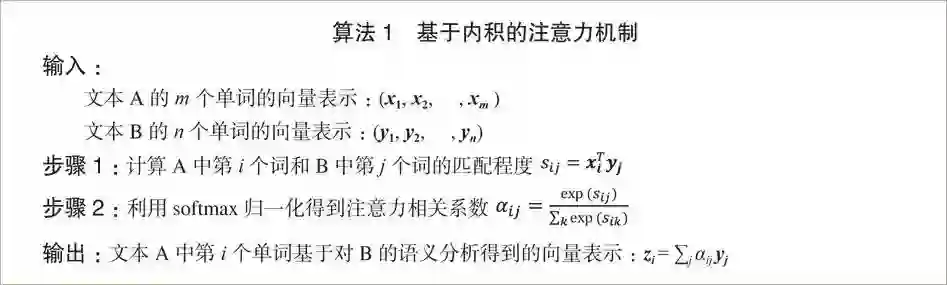 给定文本A和文本B,注意力机制可以计算出基于对B的语义分析,A中每个词语的词向量表示。算法1给出了一种基于内积的注意力机制计算方法。在注意力机制中,文本A每个词语的词向量表示是文本B词向量的一种线性组合,该组合的系数来自A和B每个词对之间的匹配程度。