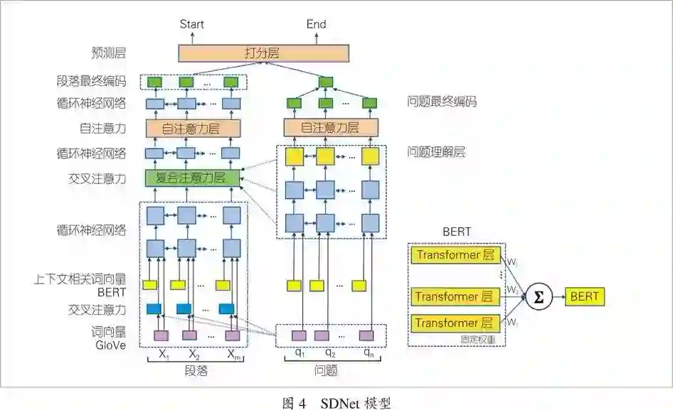在实际模型中,以上三个核心模块均会有不同变种,例如更多的循环神经网络层数、注意力机制的反复使用等。图4展示了最近在机器阅读理解多轮问答数据集CoQA上获得第一名的SDNet模型[12]。该模型使用了BERT输出层的线性组合以及复合注意力层的模块,获得了很好效果。
