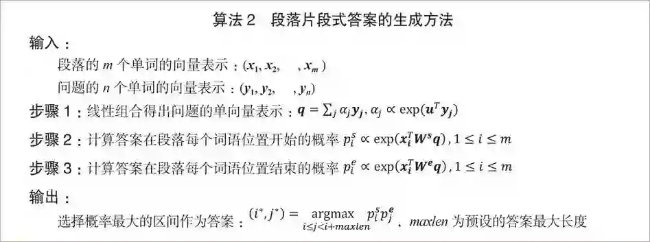 对于多项选择类型的答案,可以通过神经网络中的线性变换层生成每个选项的概率,并通过交叉熵求导优化。对于段落片段类型的答案,一般是计算段落中每个位置作为答案开始和结束的概率,并选择概率最大的区间输出。算法2给出了一个典型的段落片段类型答案的生成方法,其中u,Ws,We均为参数。