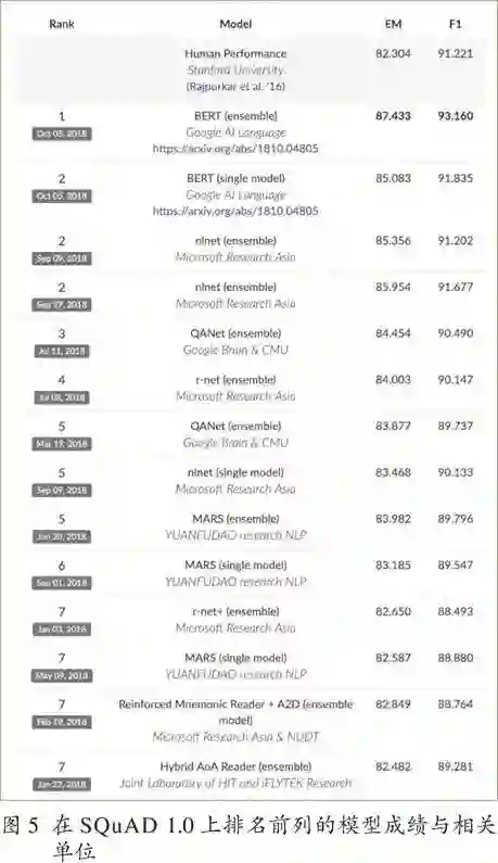 值得一提的是,在影响力很大的机器阅读理解竞赛SQuAD中,微软亚洲研究院、国防科技大学、哈尔滨工业大学与讯飞联合实验室等中国团队排在前列3(见图5)。
