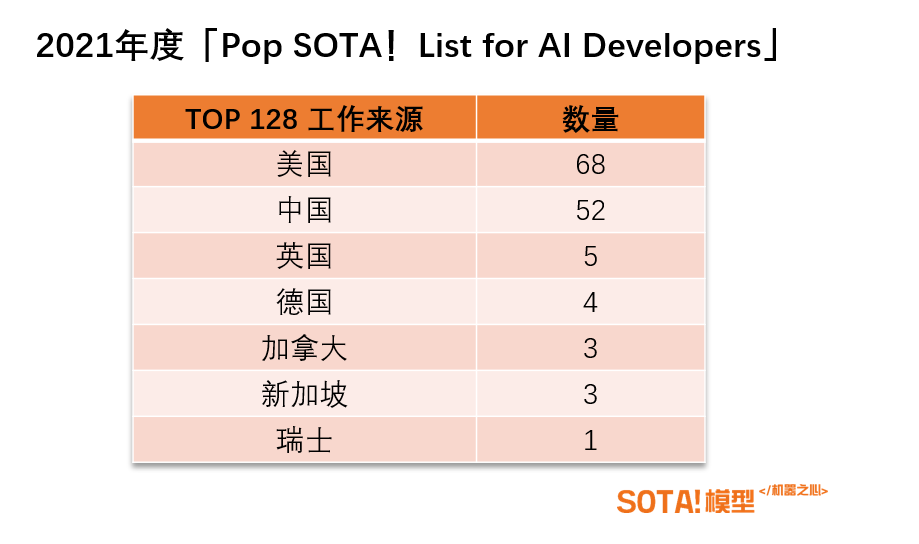 我们基于每一项技术工作核心团队的主要人员所在机构归属国家对技术进展的来源地进行标注,得到以下统计。需要注意的是,在排名前 128 位的工作中,美国、中国的工作占据了绝大部分,其中有 5 项工作是中美合作的。