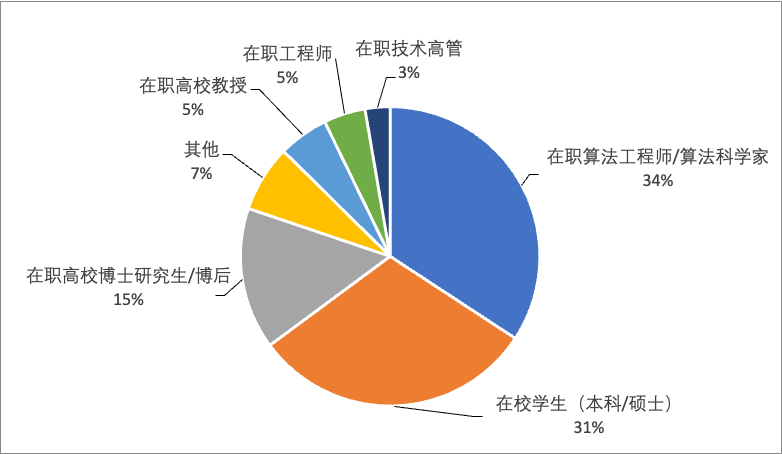 本次形成有效工作评价的人数共有 103 人。参与评价的贡献者以职算法工程师 / 算法科学(34%)、在校学生(本科 / 硕士)(31%)、在职高校博士研究生 / 博后(15%)为主。其余评价参与者的身份为在职高校教授、在职工程师和在职技术高管。
