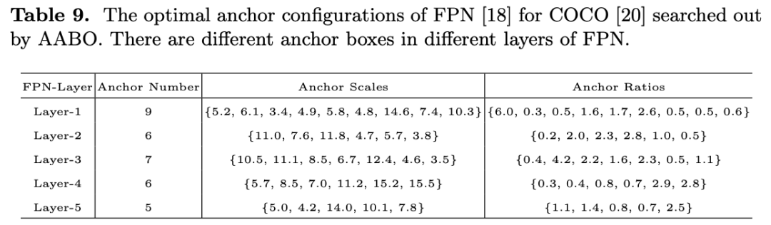 基于上面的分析,论文设计了自适应FPN的搜索空间,图4中的5个红框与上下界之间的区域即为FPN每层对应的搜索空间。具体搜索如上图所示,每层都有独立的搜索空间,层数越大,anchor的数量、尺寸范围和长宽比范围越小。实际上,与图4的黑矩形框搜索空间对比,这种自适应FPN搜索空间更大,而且每层较小的搜索空间有助于HPO算法的更集中地进行搜索。