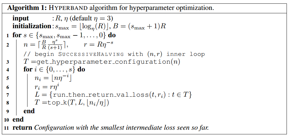 Bandit-based方法在限定资源的情况以高效的策略寻找最优超参数,资源可为时间、迭代次数等,而Hyperband是经典的bandit-based方法。Hyperband在Successive Halving算法的基础上进行了扩展,每次选取一批超参数进行多轮迭代,每轮迭代将资源
