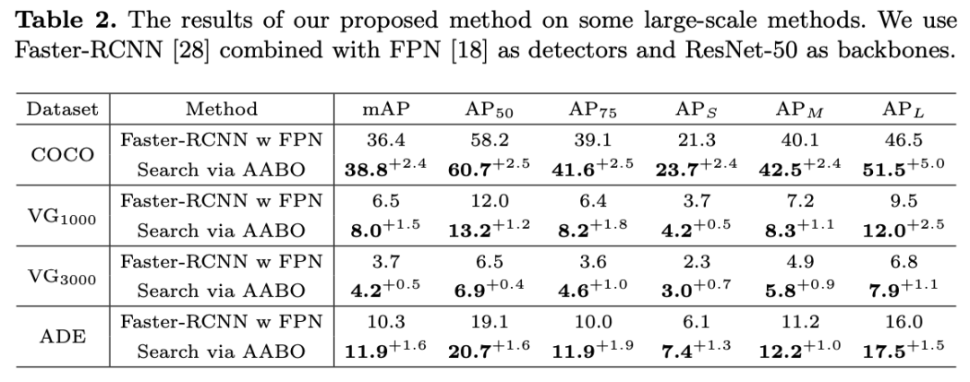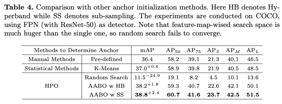 论文提出超参数优化方法AABO,该方法核心基于贝叶斯优化和Sub-Sample方法,能够自适应的搜索最优的anchor设置。从实验结果来看,AABO能够仅通过anchor设置优化,为SOTA目标检测方法带来1.4%~2.4%的性能提升。