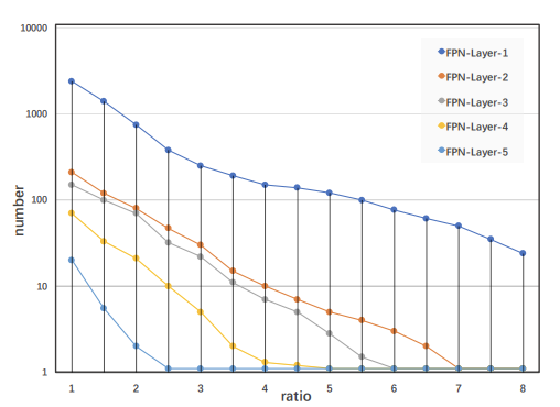 论文对FPN每层的输出进行了统计,结果如上图所示。可以看到,不同层包含不同数量和不同形状的输出,随着层数的增加,anchor的数量越少,长宽比范围也越小。