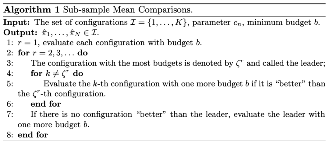 的测试,得到一批观测数据,然后每轮选取已使用资源最多超参数组合作为leader,若其它组合优于leader,则赋予其资源