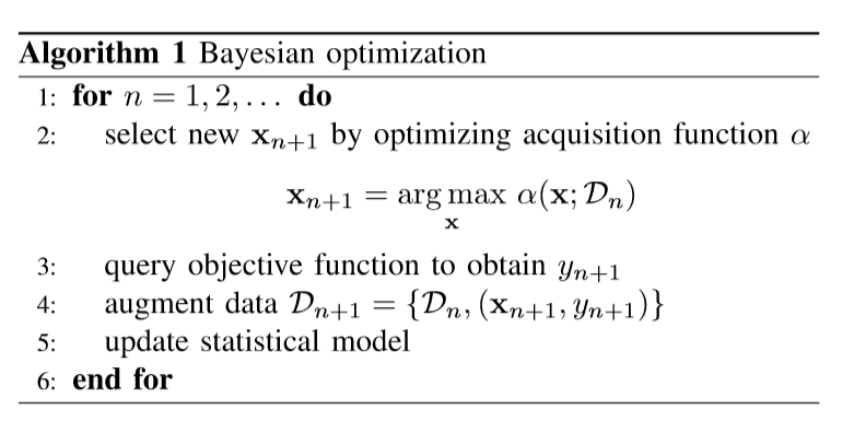 贝叶斯优化的完整流程如上面所示,在每轮的迭代中基于替代模型和采集函数获取一组超参数,然后使用目标模型进行验证,最后将验证结果加入观测数据集并更新替代模型。