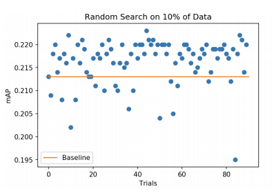 随机采样100组不同的anchor设置,每组包含3种尺寸和3种长宽比,然后与Faster R-CNN的默认anchor配置进行性能对比。结果如上图所示,红线为默认设置的性能,可以看到,默认设置并不是最优的。