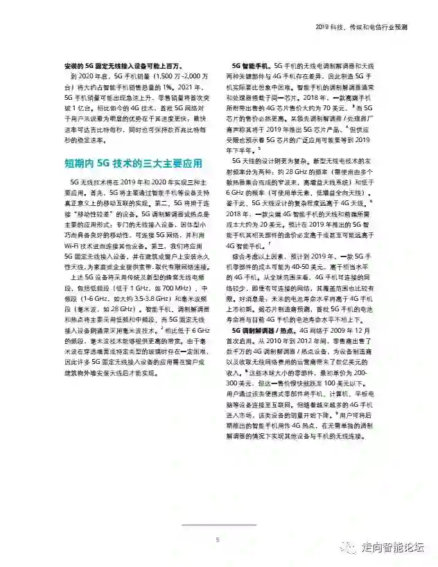 据德勤全球预测,第五代广域无线网络将在2019年实现大范围推广应用。 2018 年有 7家运营商开展 5G广域无线测试 。预计到 2019年底将有25家运营商针对部分地区(通常为城市地区) 推出 5G 服务。 2020 年, 推出 5G服务的运营商有望新增 26 家, 在 2019 年原有总数的基础上翻番一倍不止。 预计 2019 年将有大约20 家手机厂商推出具备 5G 功能的手机(首批次具备 5G 功能的手机将在 2019 年第二季度面市)。2019 年全年的智能手机销量可能达到 15 万台, 其中有大约 100万台 5G手机上市。5G调制解调器(也称“puck” 设备或热点) 的销量将达到 100 万台 , 安装的 5G 固定无线接入设备可能上百万。