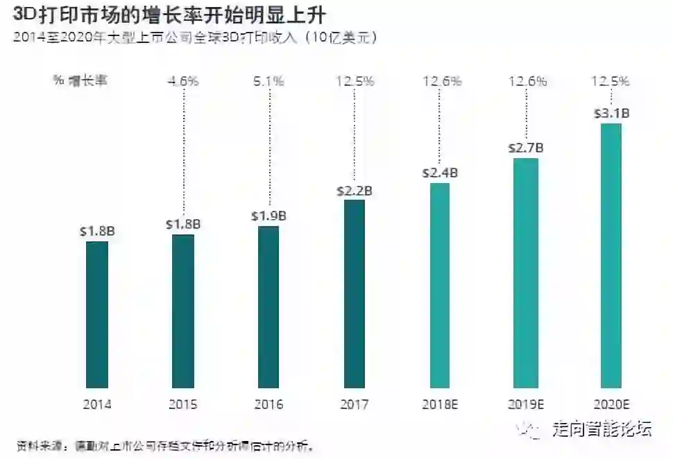 2019年大型上市公司的3D打印相关销售额将超过27亿美元,至2020年更将高达30亿美元。 该部分的 3D 打印行业将在未来两年每年增长约12.5%, 增长率是几年前的两倍多。