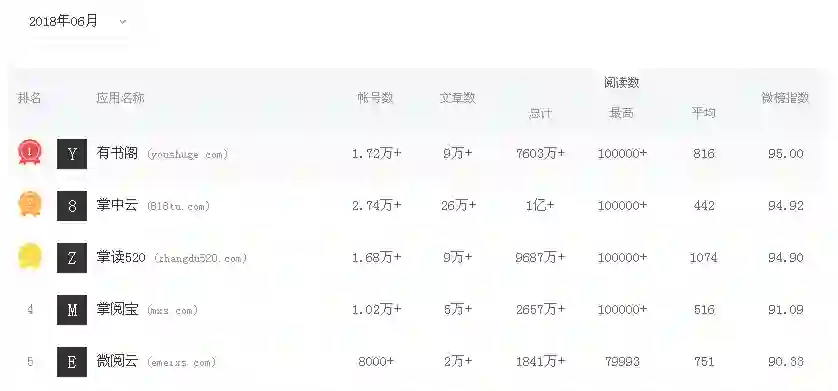通过查阅爱微帮的数据,可以看到有书阁、微阅云在接入的微信公众号和文章数上面都排名前列。