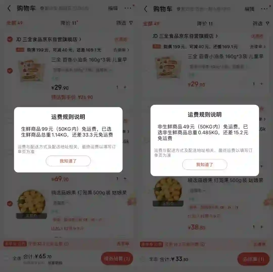 但电商自营却不愿意惯着消费者。如天猫超市需要满88元包邮,京东自营非生鲜49元包邮,生鲜99元包邮。