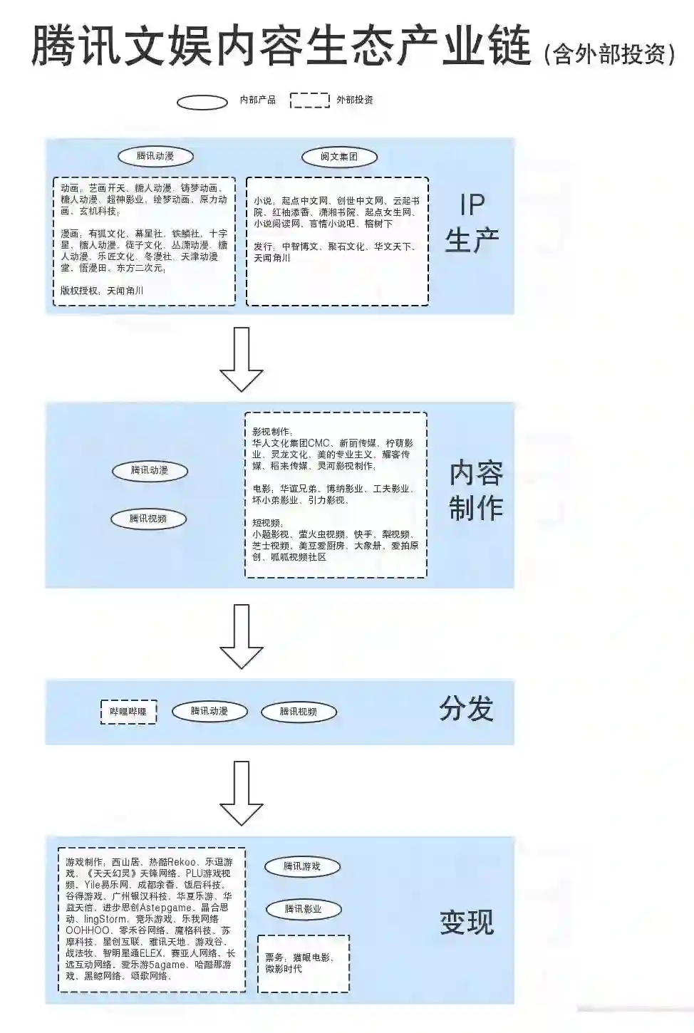 而这个大内容生态,囊括了:「生产」、「分发」、「变现」等环节,此时腾讯在自身建设内容开放平台之外,也选择通过投资布局,延伸部分。
