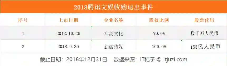 上市退出之外,2018 年腾讯也借收购之际,成功退出 2 家企业。