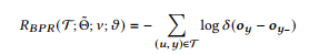 因此,我们需要为每一个真实物品label(y)采样一个负样本y-,通过计算用户的隐向量与y和y-的隐向量的内积作为两个item的打分oy和oy-,然后算出最终的BPR loss如下: