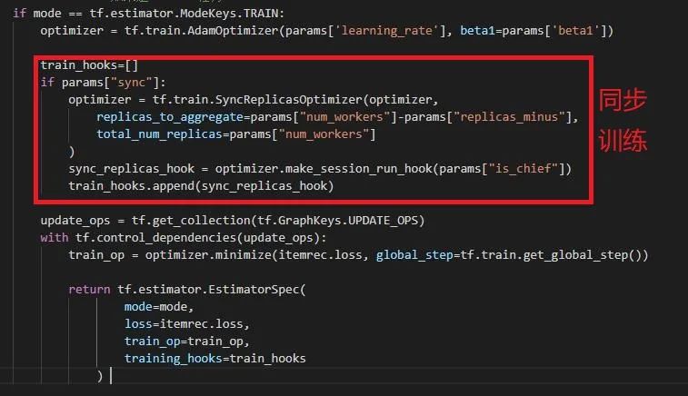 model_fn函数:模型的网络结构、loss已在上一节中介绍,这里只给出了定义train_op的部分。这里采用了同步更新机制,每个worker节点直接访问外部存储系统(hdfs)获得一个batch,然后计算loss和gradient,汇总到PS节点,当所有worker节点都完成一个batch时,才更新一次参数;在实际实验中,我们通过调节replicas_to_aggregate,我们通过忽略几个速度慢的worker梯度来加速训练 。