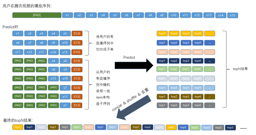 最后将用户对应的所有子序列的top-N结果,经过concat、shuffle和去重,得到用户最终的top-N推荐列表。