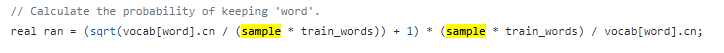 Word2vec的实现中,会指定一个概率P(wi)对高频词进行打压,同时保留所有的低频词。实际源码中,高频词在每个样本中被保留的概率实现如下: