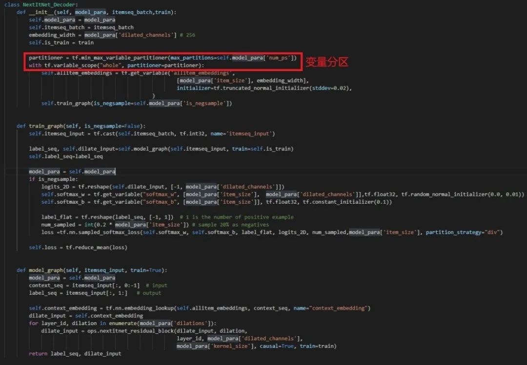 PeterRec模型的网络结构是比较简单高效的,且空洞卷积的使用也使得模型能够并行训练和降低显存需求,这里直接复用了源码中的模型结构和模型补丁结构。另外,在采用PS策略进行分布式训练时,为了均衡ps节点的负载和加速训练,最好是对模型参数做分区,以便模型参数被均匀分配到各个ps上。