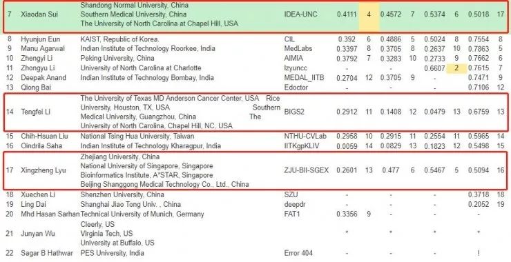 同时,国内学术机构也与国外顶级医疗机构合作开发相关的疾病算法。据 AI 科技评论了解,在这份表单上,山东师范大学和南方医科大学以及北卡罗来纳大学教堂山分校进行合作;南方医科大学与休斯顿的 MD 安德森癌症中心牵手;浙江大学与新加坡国立大学、新加坡生物信息学研究所以及北京上工医信公司等合作,这些医工结合的团队在竞赛中的表现也不俗。