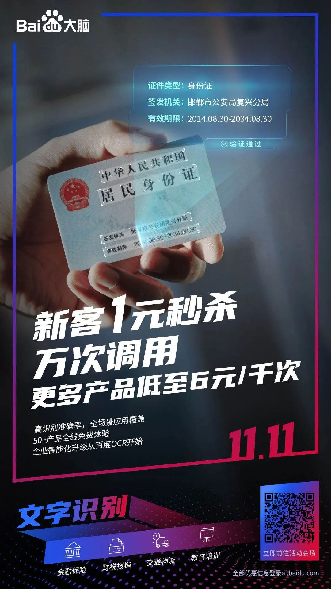 百度大脑人脸识别技术系列产品1.7折限时抢购,实名认证首单一元购,适用于金融核验、线上实名认证、考勤通行管理、安全防控等场景。