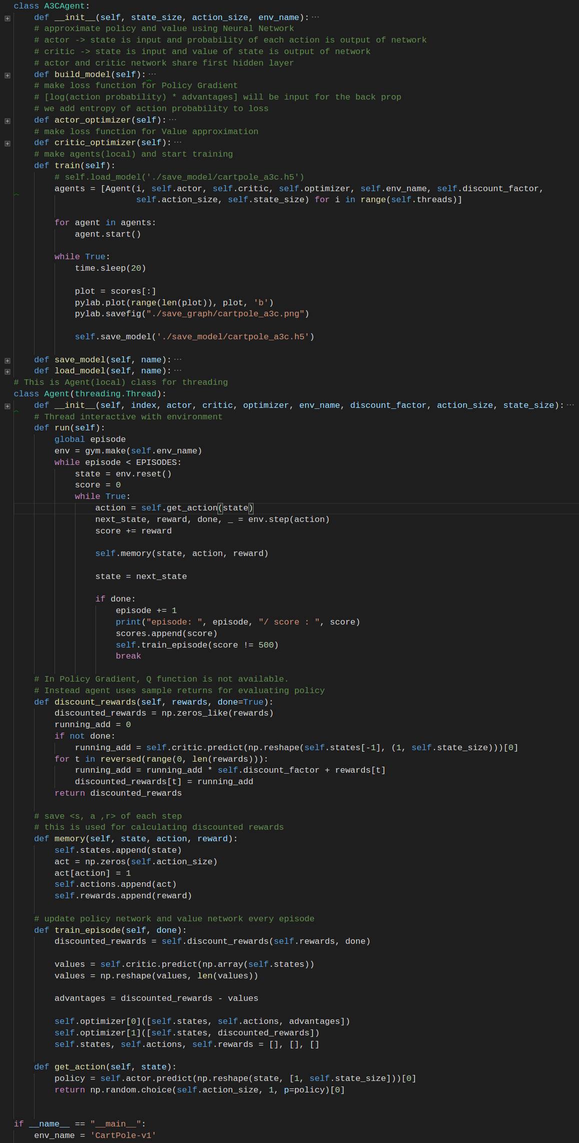 https://github.com/rlcode/reinforcement-learning/blob/master/2-cartpole/5-a3c/cartpole_a3c.py