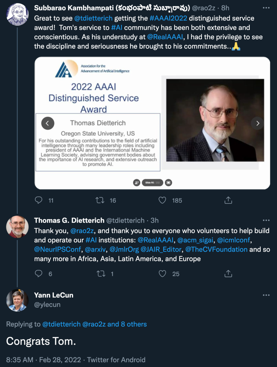 今年的获奖者为俄勒冈州立大学计算机科学系的名誉教授、机器学习领域的先驱之一 Thomas Dietterich,表彰他通过担任 AAAI 主席和国际机器学习协会主席等职务对人工智能领域的贡献。