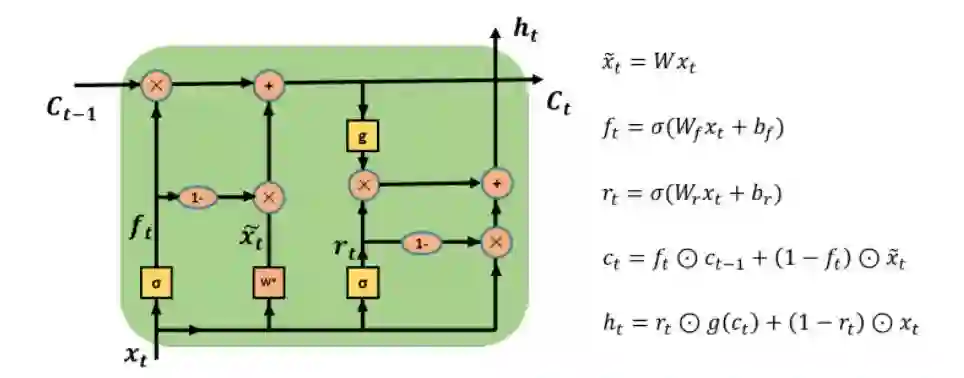 熟悉LSTM的人很容易理解SRU的网络结构图,下图是SRU的网络结构图: