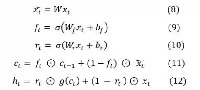 根据上文中的公式看出 ft 、 rt 都与 ht-1 有关,也就是要想计算 ht 必须等到前一时刻ht-1计算完成,这样就破换了并行性和独立性,无法实现并行化处理,针对此问题,提出了完全drop连接,就是去除了 ht-1 的依赖,以下是SRU的公式: