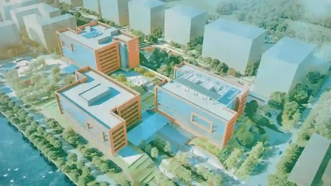 这是已建成的微软大楼一期,但由于苏州微软这边扩招速度非常夸张,现在一期的大楼已经坐不下了。目前二期大楼正在建造当中,未来还有三期规划,最终建成的效果图应该如下所示。