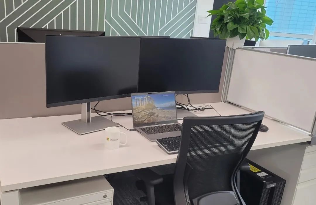 然后是自己的工位,微软办公区的工位还是非常宽敞的,每位员工都会拥有一台主机、两台显示器和一台笔记本用于工作。