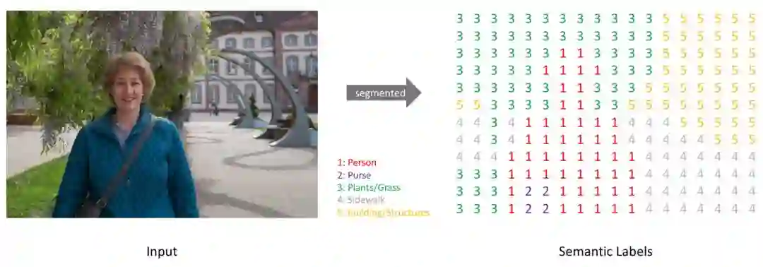 简单地说,我们的目标是要用 RGB 图(高 x 宽 x3)或灰度图(高 x 宽 x1)为输入,并输出一个分割图,在分割图中每个像素都包括一个用整数表示的类别标签(高 x 宽 x1)。