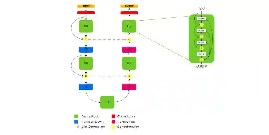 该架构的一个非常重要的方面是上采样路径在密集块的输入和输出之间没有跳过连接。作者还指出,因为「上采样路径增加了特征图空间分辨率,特征数量的线性增长对内存要求过高。」因此,只有密集块的输出在解码器模块中传递。