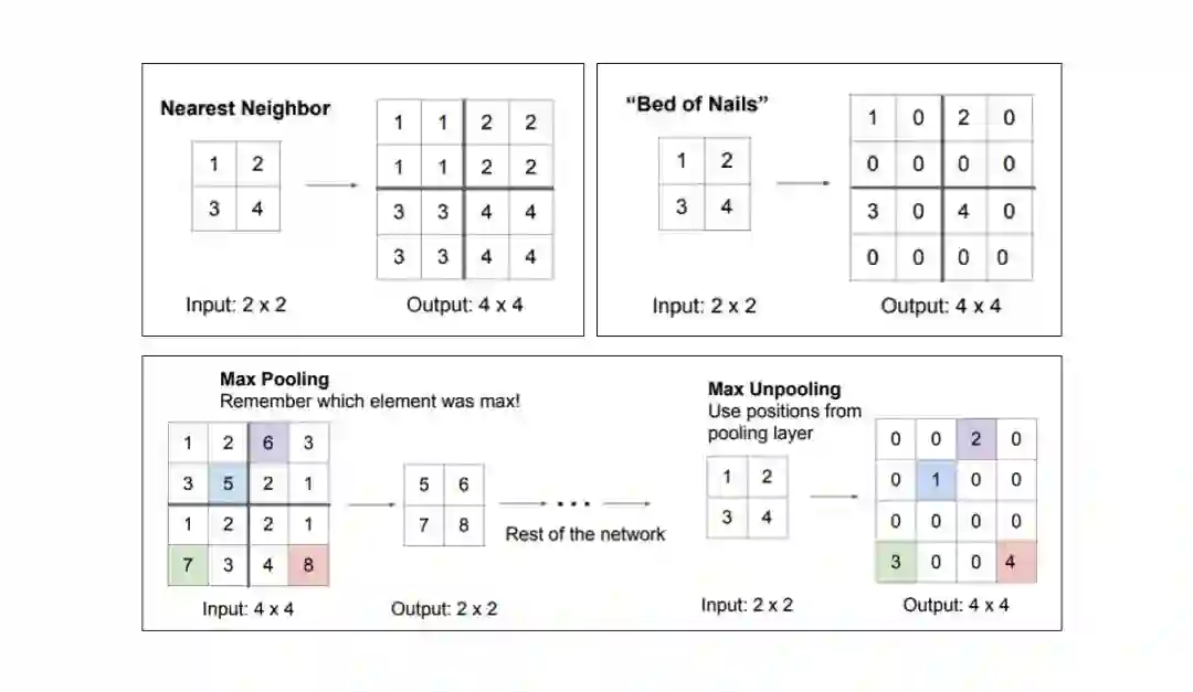 我们可以用很多不一样的方法对特征图的分辨率上采样。池化操作通过汇总局部区域的单个值(平均池化或最大池化)下采样分辨率,「上池化」操作通过将单个值分配给更高的分辨率对分辨率进行上采样。