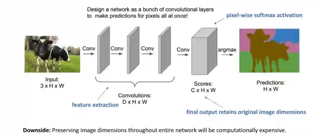 针对这项任务简单地构建神经网络架构的方法是简单地堆叠大量卷积层(用 same 填充保留维度)后输出最终的分割映射。通过特征图的接连转换,直接从输入图像学到了相对应的分割映射;然而,在整个网络中要保留完整分辨率的计算成本是很高的。