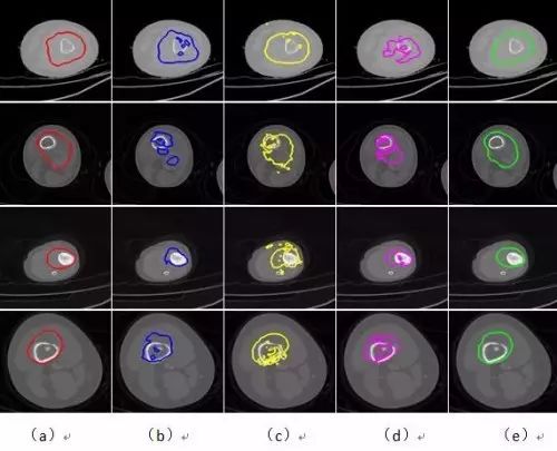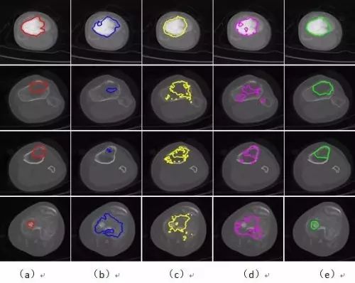 图1 病灶位于骨上的骨肉瘤 CT 图像分割结果。1~4行为4个不同的样本。(a)金标准;(b)~(e)分别是 FCN,U-Net,HED,MSFCN 的分割结果。